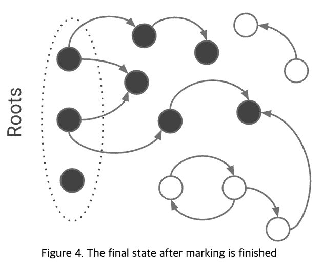 - 최종적으로 검은색 객체는 도달 가능한 객체이며, 흰색 객체는 가비지 컬렉션 대상으로 간주됩니다.