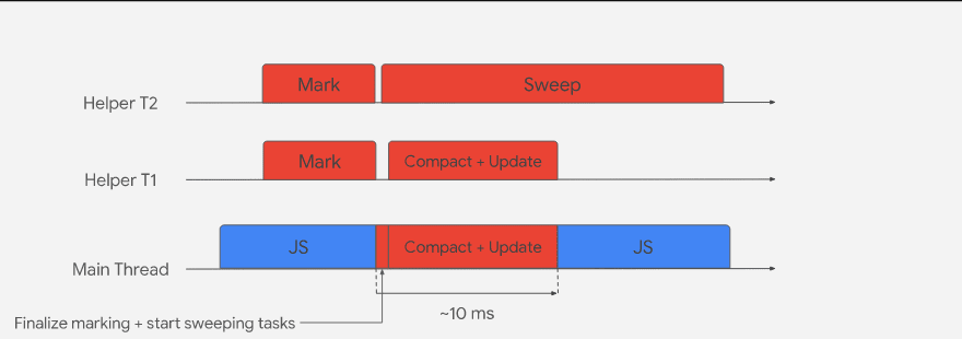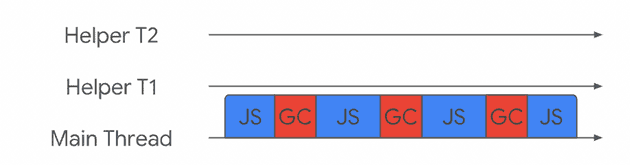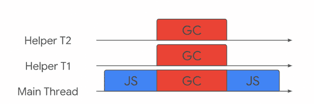 Concurrent GC는 가비지 컬렉션 작업을 메인 스레드 대신 헬퍼 스레드에서 백그라운드로 수행합니다. 메인 스레드는 JavaScript 실행에만 집중할 수 있으므로 Stop-the-World 시간이 사실상 제거됩니다.