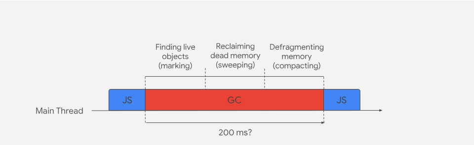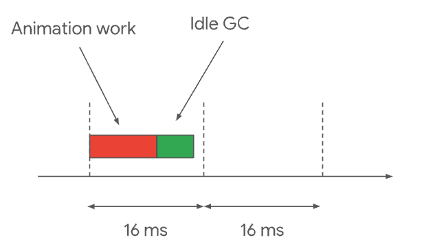 GC 작업은 애플리케이션의 유휴 시간(idle time)을 활용하여 실행됩니다. 예를 들어, 크롬 브라우저는 60FPS로 동작하며, 각 프레임 렌더링에 약 16ms를 사용합니다. 만약 프레임 렌더링이 16ms보다 빨리 끝나면, 남은 유휴 시간에 GC 작업을 수행합니다.