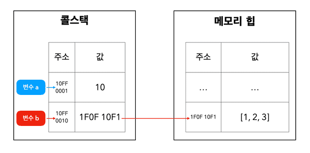 const a = 10; // primitive 타입은 메모리 스택 영역에 저장 const b = [1, 2, 3]; // 배열, 함수, 객체는 힙 영역에 저장