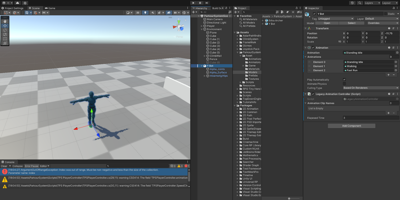 public class LegacyAnimationController : MonoBehaviour { Animation _animation; public List<string> animationClipNames = new List<string>(); public float ElapesedTime = 3; private float timer = 0; private int currentIndex = 0; void Start() { _animation = GetComponent<Animation>(); foreach (AnimationState state in _animation) { animationClipNames.Add(state.name); } } void Update() { timer += Time.deltaTime; if(timer> ElapesedTime) { currentIndex++; if (currentIndex >= animationClipNames.Count) currentIndex = 0; _animation.Play(animationClipNames[currentIndex]); timer = 0; } } }마무리