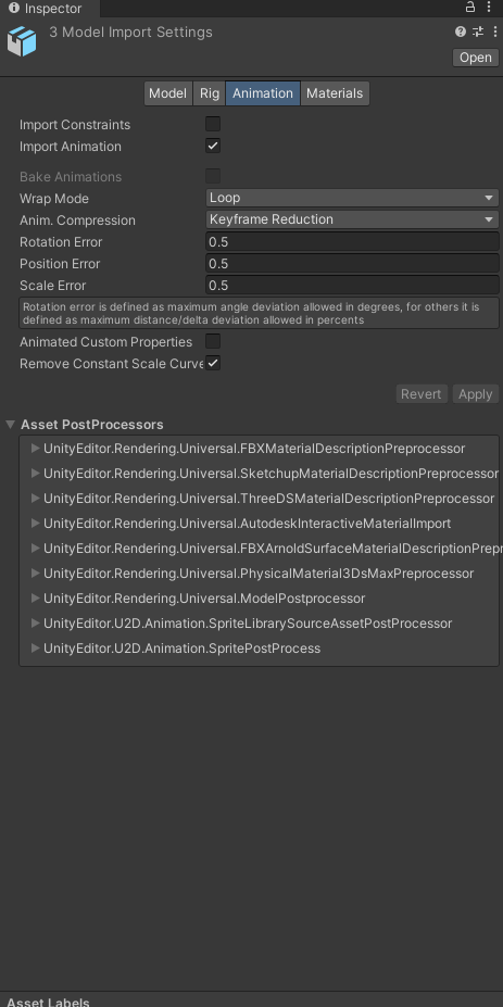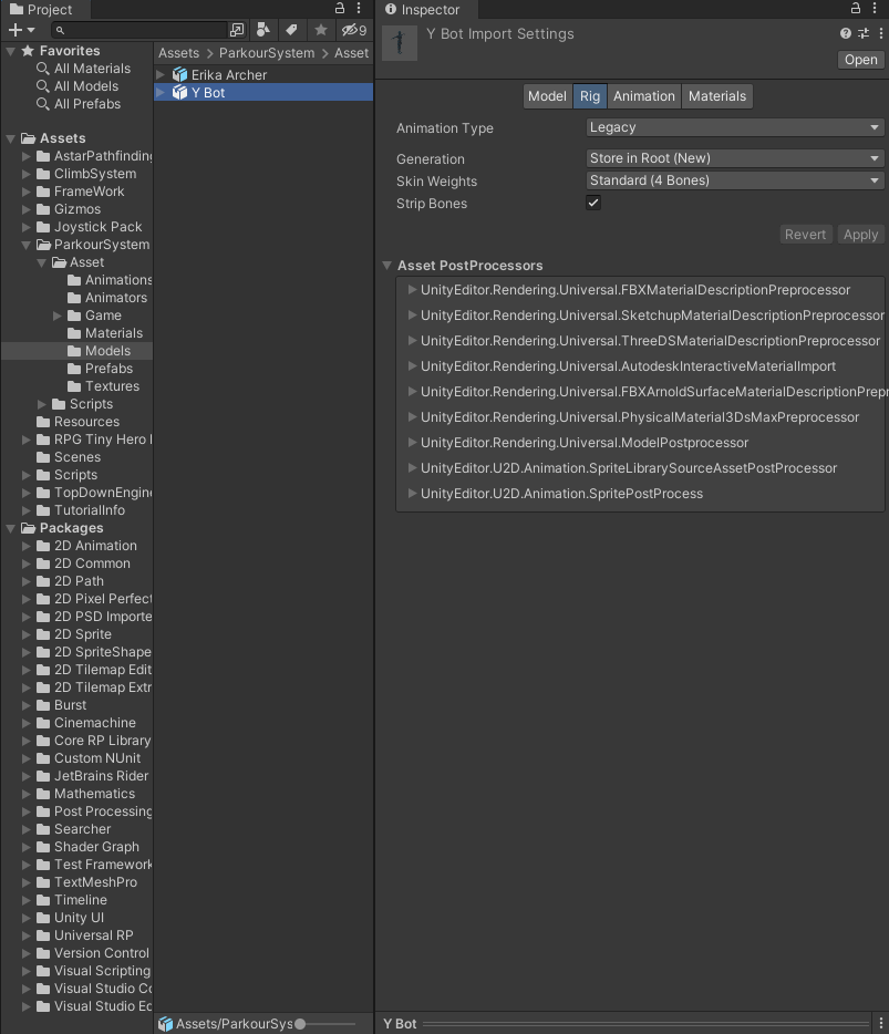레거시 애니메이션을 활용하기 위해서는 모델의 애니메이션 타입을 Legacy로 설정하고 Animation 콤포넌트를 추가해야 합니다. 그리고 Legacy 애니메이션으로 설정된 애니메이션들을 Animation 콤포넌트에 추가합니다.
