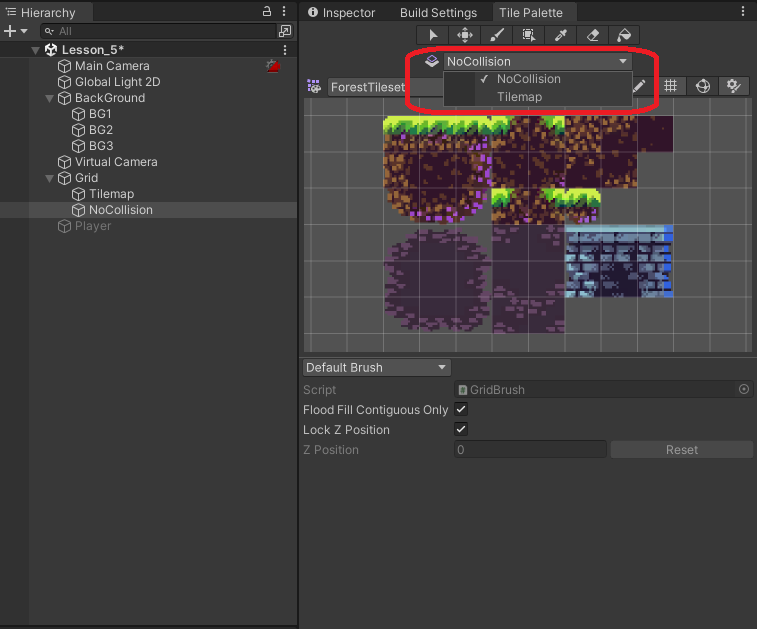 이제 NoCollision에도 Tile을 그릴 수 있게 되었습니다. Tile Palette Inspector에서 Tile Map을 NoCollision으로 변경하고 충돌 설정을 안할 배경들은 NoCollision Tile Map에 그리면 됩니다.