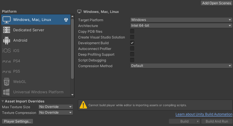 2, 빌드 설정 구성 : Scenes In Build 목록에 클라이언트 장면 추가.
