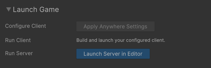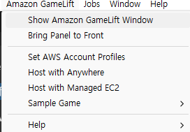 1, 서버 실행 메뉴 : Unity 편집기에서 Amazon GameLift > Host with Anywhere > Launch Game를 선택합니다.