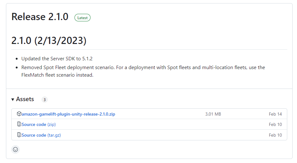 Amazon GameLift 플러그인을 Unity 프로젝트에 설치하고, 샘플 게임을 사용해 GameLift의 기능을 테스트하는 방법을 단계별로 설명하겠습니다. 우선 AWS GameLift Unity Plugin을 다운 받아야 합니다. 아래에 링크로 들어가서 Release를 클릭하고 2.1.0 버전 Zip 파일을 다운 받습니다. 또한 AWS CLI을 설치해서 서버 작업을 CLI로 컨트롤 할 수 있도록 합니다.