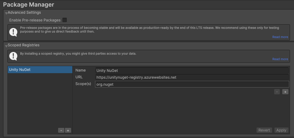 Name: Unity NuGet URL: https://unitynuget-registry.azurewebsites.net Scope(s): org.nuget