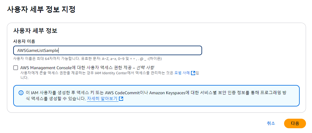 3, 사용자 이름을 입력 (예: GameLiftUnityUser).