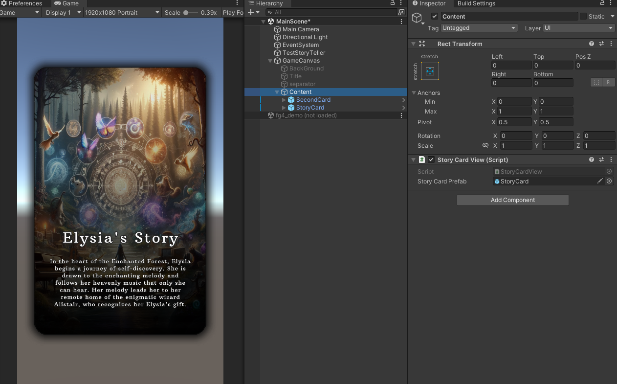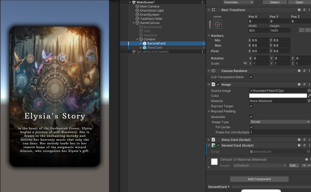 using UnityEngine; public class SecondCard : MonoBehaviour { private StoryCardEffect _storyCardEffect; // 첫 번째 카드에 적용된 StoryCardEffect 컴포넌트를 참조합니다. private GameObject _firstCard; // 첫 번째 카드의 GameObject를 참조합니다. void Start() { _storyCardEffect = FindObjectOfType<StoryCardEffect>(); // Scene 내에서 StoryCardEffect 컴포넌트를 찾아 참조합니다. _firstCard = _storyCardEffect.gameObject; // 찾은 StoryCardEffect 컴포넌트가 부착된 GameObject(첫 번째 카드)를 참조합니다. _storyCardEffect.cardMoved += StoryCardMovedFront; // 첫 번째 카드가 움직였을 때 호출될 메서드를 이벤트에 등록합니다. transform.localScale = new Vector3(0.8f, 0.8f, 0.8f); // 두 번째 카드의 초기 크기를 설정합니다. } void Update() { float distanceMoved = _firstCard.transform.localPosition.x; // 첫 번째 카드가 이동한 거리를 계산합니다. if (Mathf.Abs(distanceMoved) > 0) { // 첫 번째 카드가 이동함에 따라 두 번째 카드의 크기를 점진적으로 변경합니다. float step = Mathf.SmoothStep(0.8f, 1, Mathf.Abs(distanceMoved) / (Screen.width / 2)); transform.localScale = new Vector3(step, step, step); // 두 번째 카드의 크기를 업데이트합니다. } } void StoryCardMovedFront() { gameObject.AddComponent<StoryCardEffect>(); // 첫 번째 카드가 움직임을 마친 후 두 번째 카드에 StoryCardEffect 컴포넌트를 추가합니다. Destroy(this); // SecondCard 컴포넌트 자체를 제거합니다. 이제 이 객체는 StoryCardEffect의 동작을 따릅니다. } }3, StoryCardView