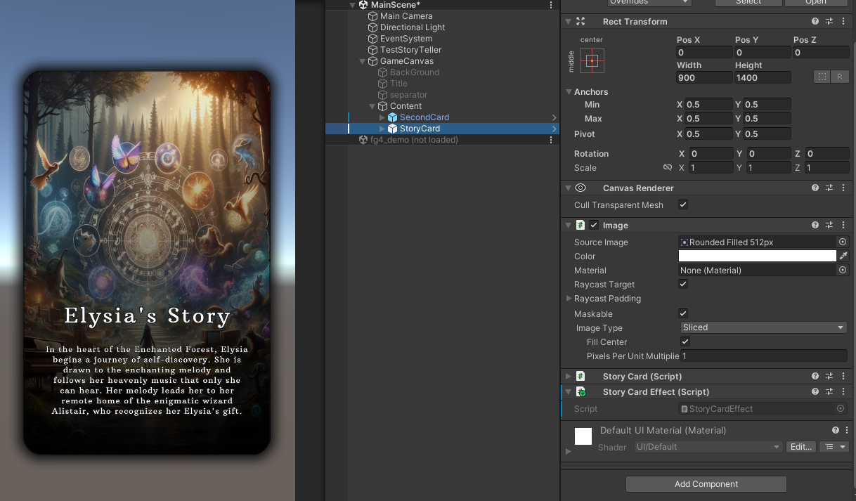 StoryCardEffect 스크립트는 카드의 스와이프 동작을 처리합니다. IDragHandler, IBeginDragHandler, IEndDragHandler 인터페이스를 구현해 드래그 동작을 감지하고, 카드의 위치와 회전을 조정합니다. 사용자가 카드를 충분히 멀리 드래그하면, 카드는 화면 밖으로 스와이프되며 페이드 아웃됩니다.