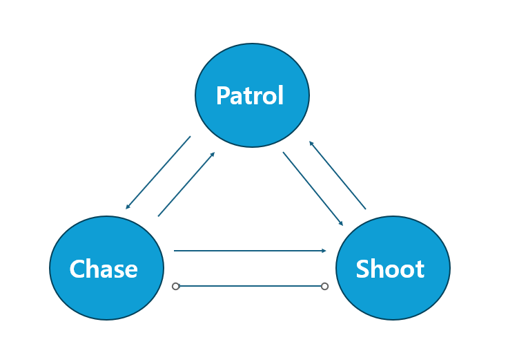 AI의 행동에 따라 적절한 상태로 전환하기 위한 조건을 체크하는 로직을 추가합니다. 매 프레임마다 플레이어와의 거리에 따라 순찰, 추적, 사격 중 하나의 상태로 전환합니다.