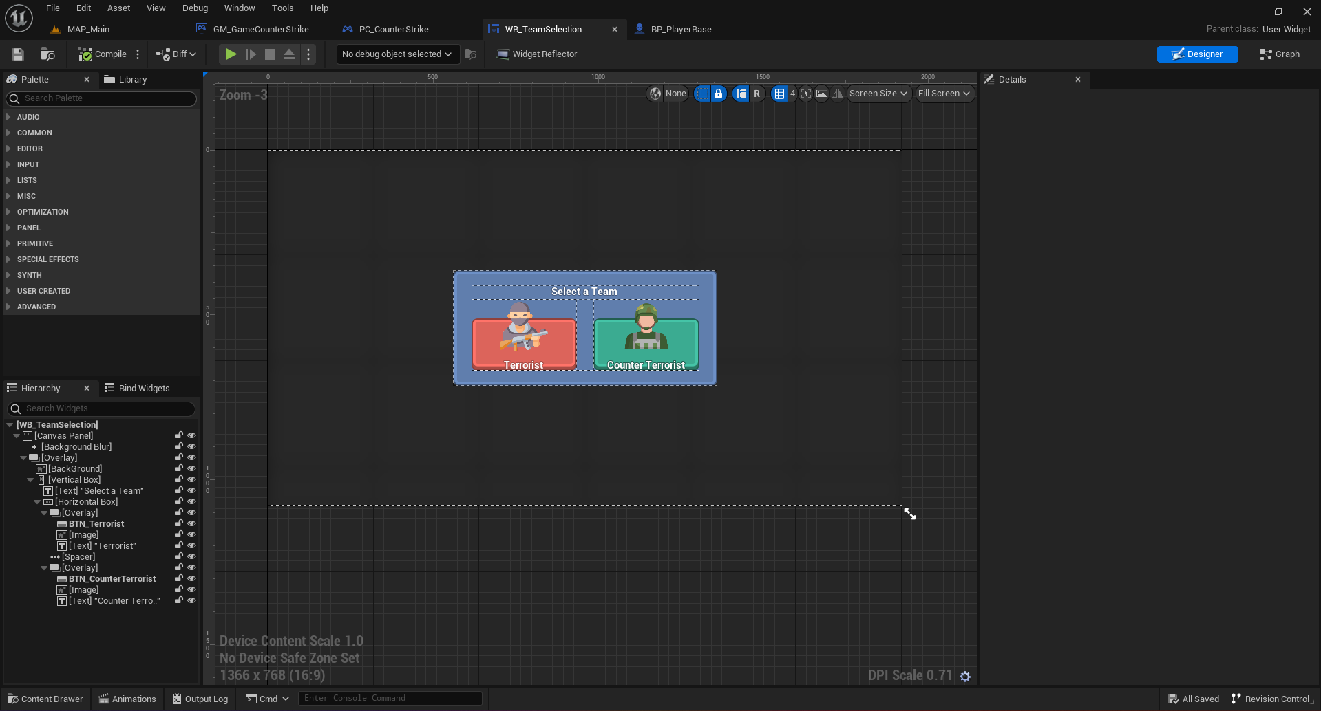 - UMG (Unreal Motion Graphics) Editor를 사용하여 TeamSelection Widget을 디자인합니다.