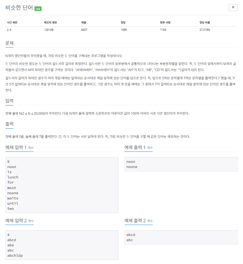 N개의 영어 단어 중에서 가장 긴 접두사를 공유하는 두 단어를 찾는 문제를 해결해야 했습니다. 접두사의 길이를 기준으로 두 단어의 유사성을 평가하며, 조건에 맞는 단어 쌍을 입력 순서를 유지한 상태로 출력해야 했습니다.