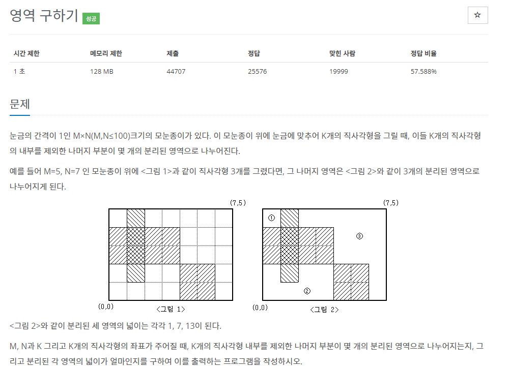 "영역 구하기" 문제는 M×N 크기의 모눈종이에서 K개의 직사각형 영역이 주어졌을 때, 직사각형으로 덮이지 않은 나머지 부분이 몇 개의 분리된 영역으로 나누어지는지, 그리고 각 영역의 넓이를 구하는 문제입니다.